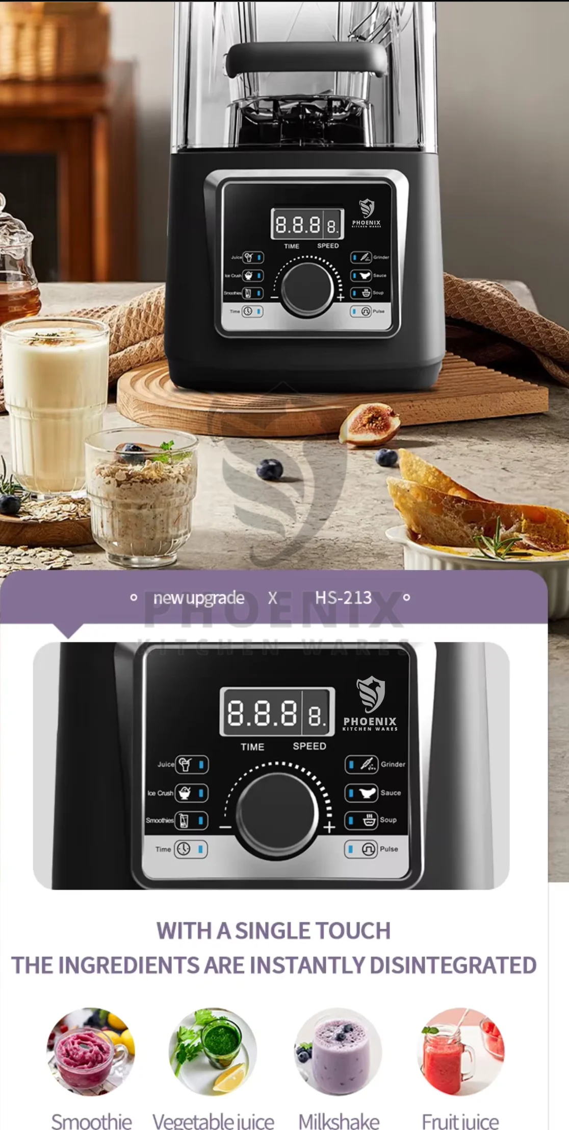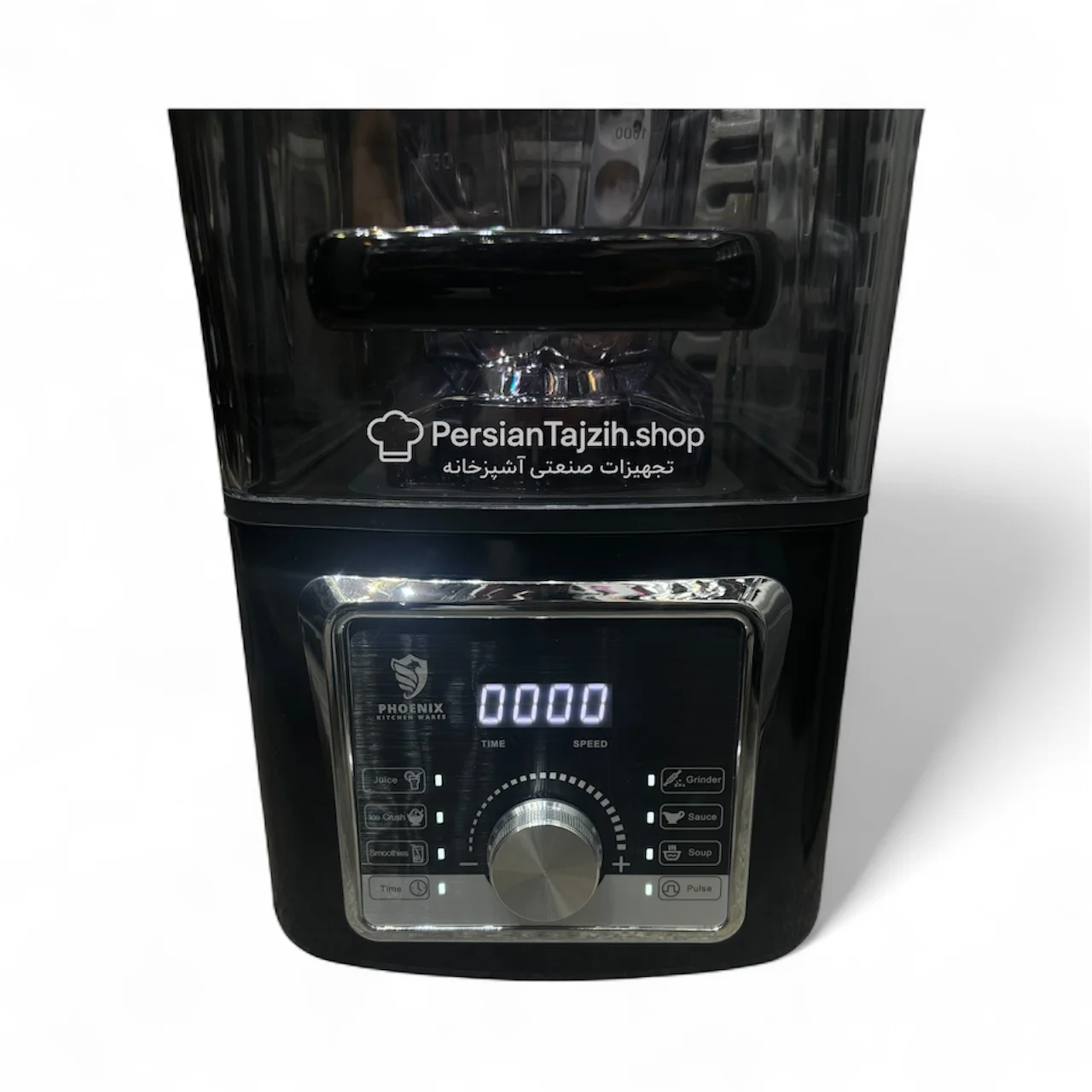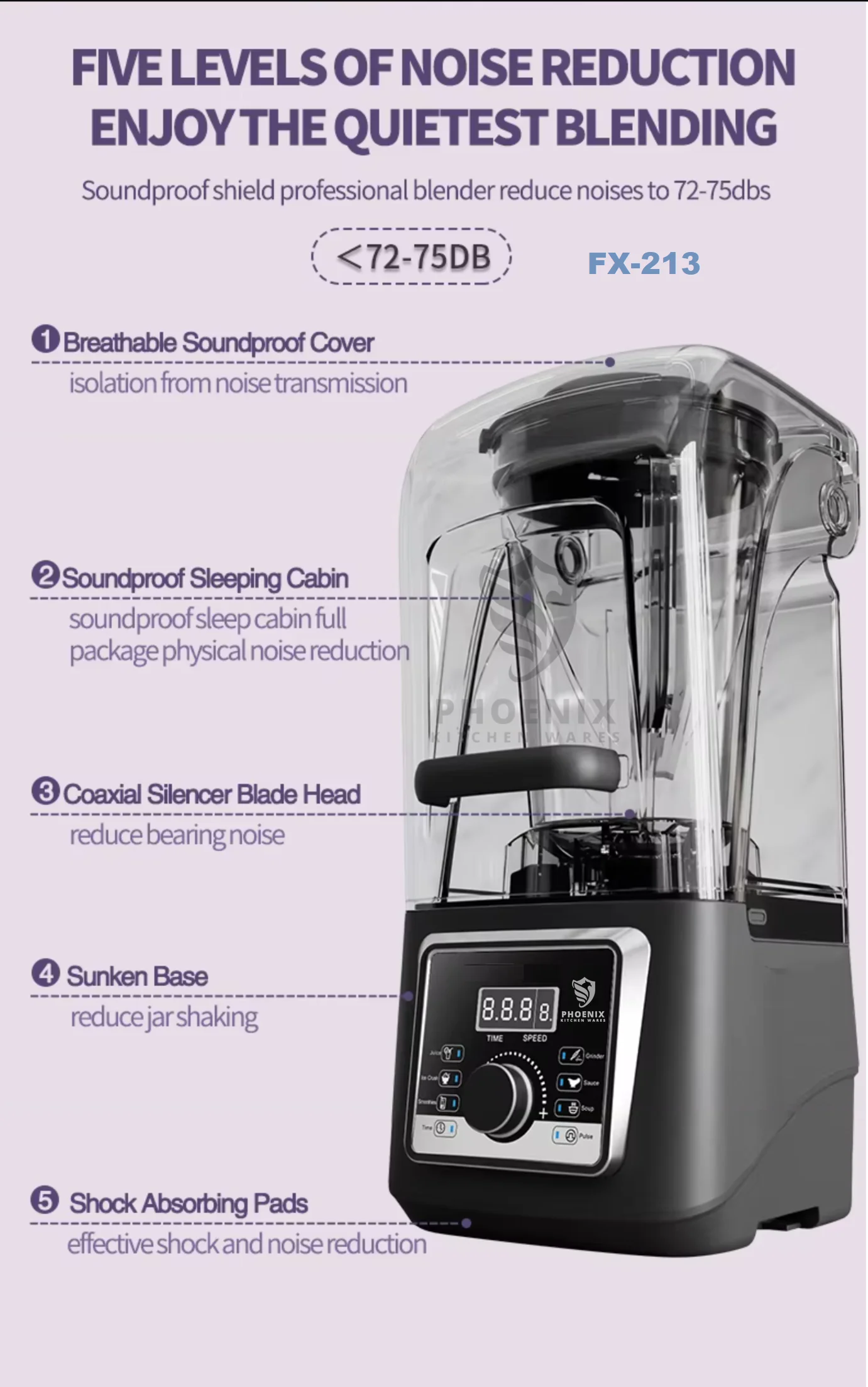 بلندر صنعتی فونیکس مدل FX-213 یکی از جدیدترین و پیشرفتهترین محصولات برند PHOENIX است که با سیستم عایق صدا (Soundproof Shield) طراحی شده تا عملکردی بیصدا، قدرتمند و حرفهای را ارائه دهد. این مخلوطکن با توان ۲۲۰۰ وات، پارچ ۲.۵ لیتری پلیکربنات نشکن و کاور کاهش صدا پنجمرحلهای، انتخابی ایدهآل برای کافیشاپها، آبمیوهفروشیها و فضاهای کاریای است که سکوت و کارایی همزمان اهمیت دارند.