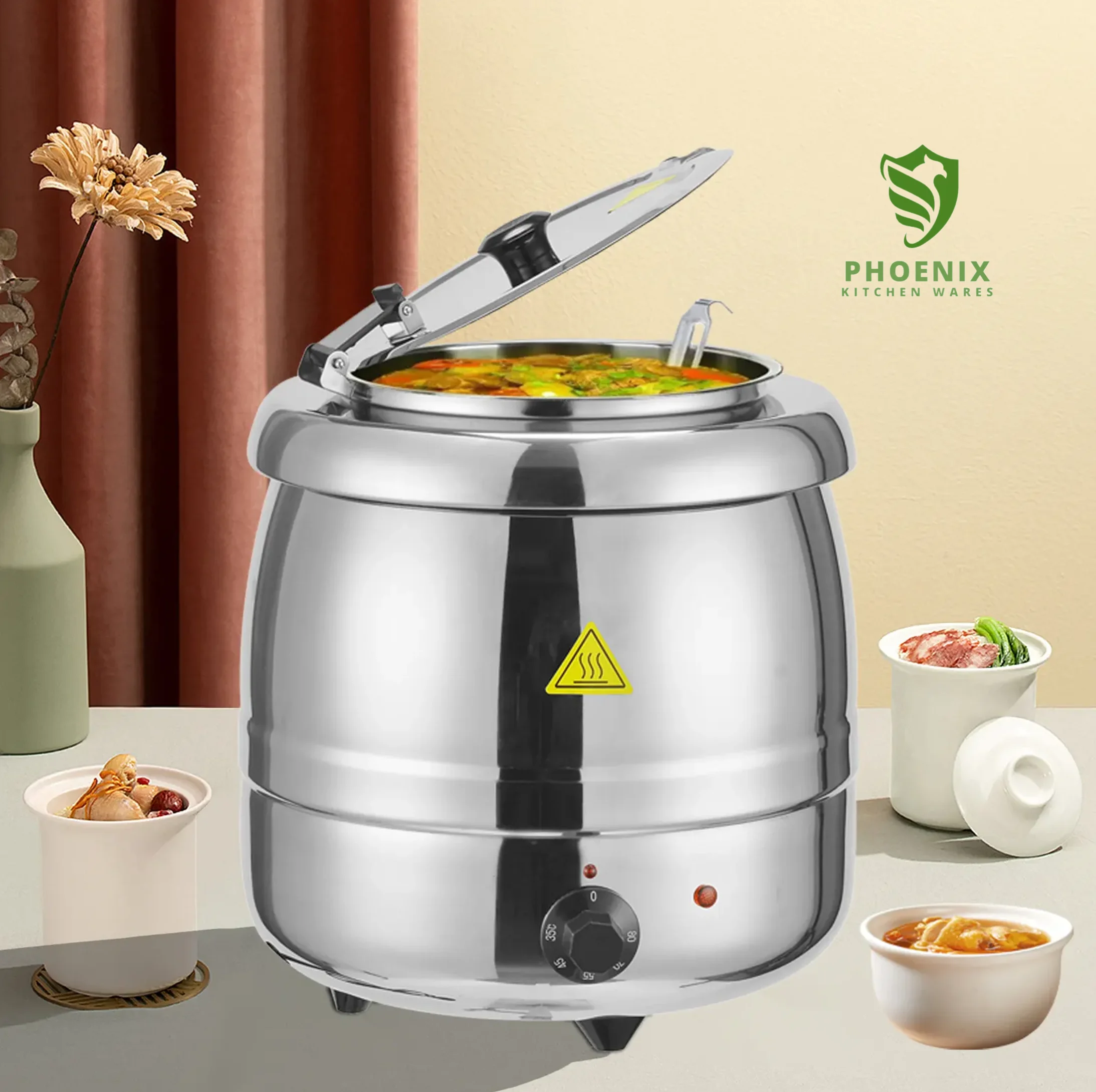 سوپ گرمکن ۱۰ لیتری تمام استیل فونیکس (Phoenix) با طراحی حرفهای، مخزن بهداشتی و قابلیت تنظیم دما از ۳۰ تا ۸۶ درجه، گزینهای ایدهآل برای نگهداری گرم سوپ و خورش در رستورانها و بوفههاست.